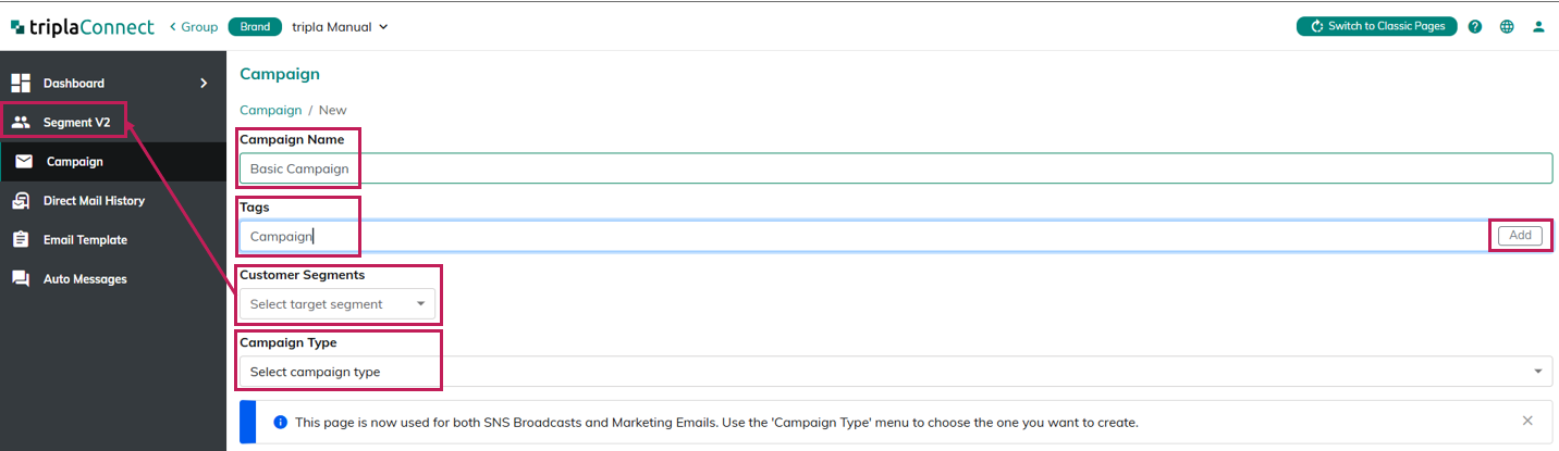 | 3. Customer Segments | ・Select target "Customer Segment" from the dropdown list to sent the campaign mail. ・"Customer Segment" dropdown list can be set on "Segment V2" |