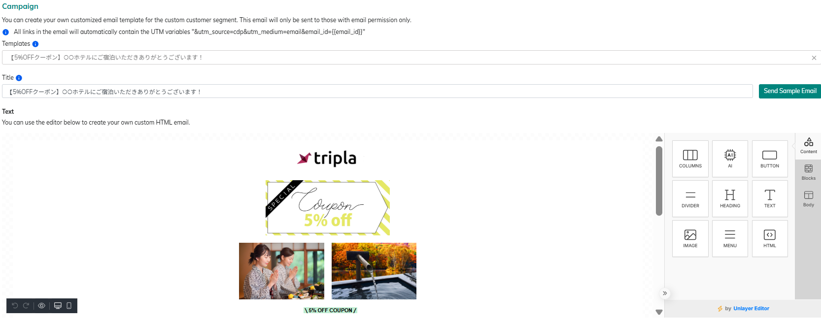 1. Template Select template text prepared by tripla from the dropdown menu. 2. Title ・Enter the subject line that will be displayed to recipients.・Variables provided by tripla can be used in the format {{variable}}.▼Example:{{brand_name}} – The brand name registered in the tripla admin screen is applied.▼Info:*Variables can also be used in the title and body by specifying {{variable_name}}.The following three variables are available:{{member_first_name}} – First name{{member_last_name}} – Last name{{brand_name}} – Brand name3. Text Enter detailed formatting options from the [Content], [Blocks], and [Body] sections in the menu on the right. 4. Content Set the content button, text or images. 5. Blocks Divide the email body into blocks and enter different content in each block. 6. Body Set the text color, background color, content width, alignment, font, and font weight. 3.2 SNS Broadcast