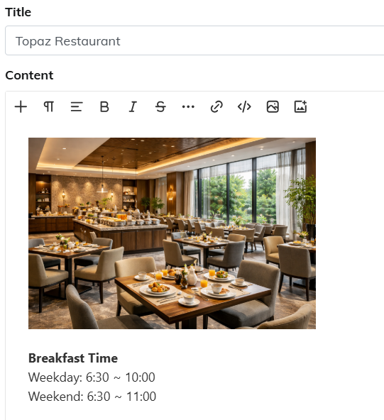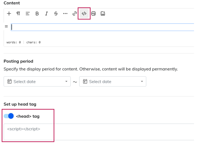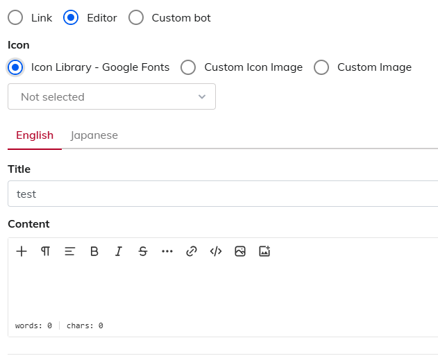Content | Create content using text and images. *This option is displayed only when the content type is set to "Editor". For details about the editor, please refer to this guide. |