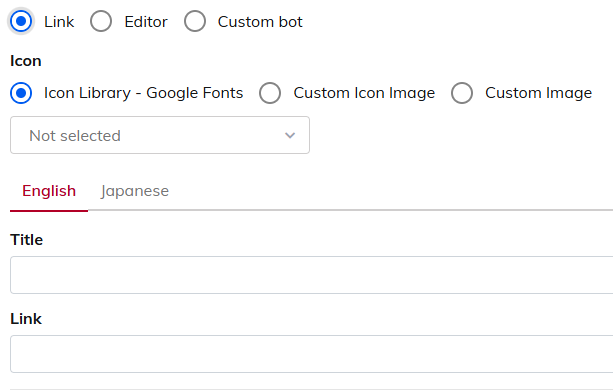 | Link | Create a link button simply by entering an icon, title, and link URL. *Destination URL is required for this option, if link is not entered, an error will occur and setting cannot be saved. |