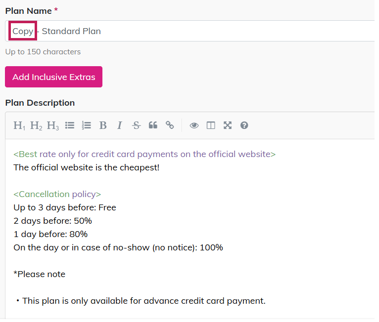 Purpose: This section is to explain how to bulk editing for Plans. ⏱ Estimated time: ~5min 1. Where to Set Setting page: Brand Management screen Action: 'Setting' → 'Booking Engine' → [Plan Management] 2. How to Bulk Edit Plans Step 1 Select the ...