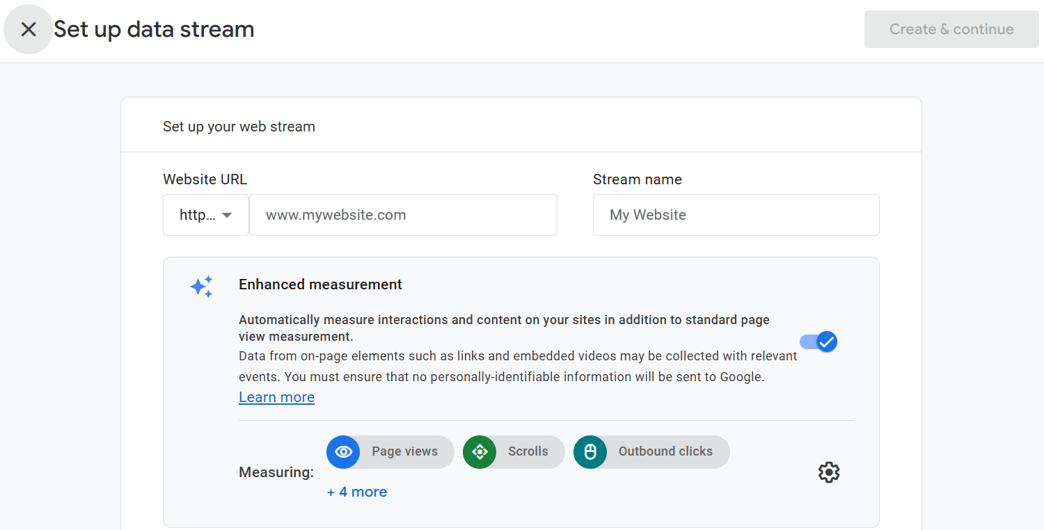Step 4 | Enter the [website URL] to be measured and the [stream name], then select [Create & continue]. |