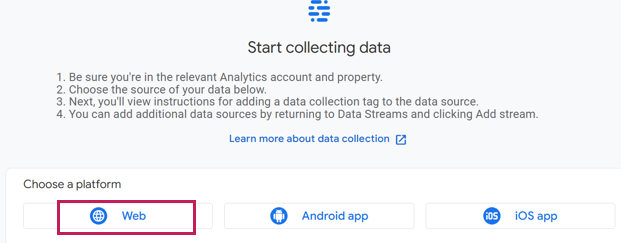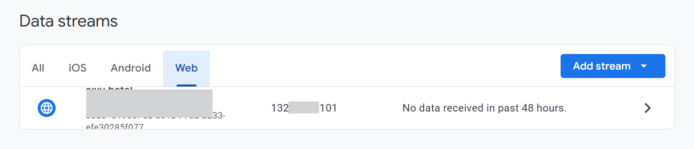 Step 5 | The screen is redirected to "Data Streams". From [Web], select the newly created stream. |