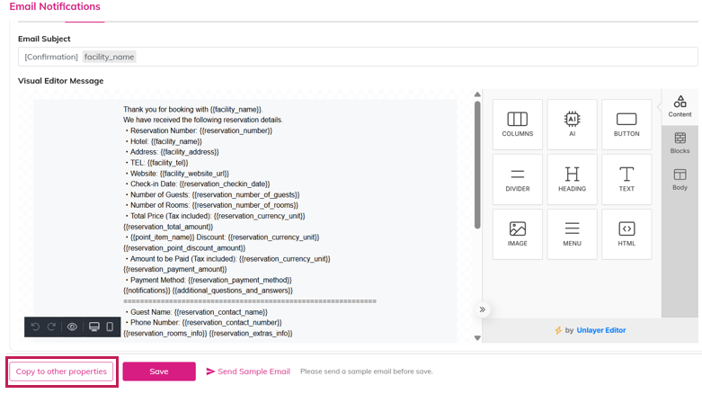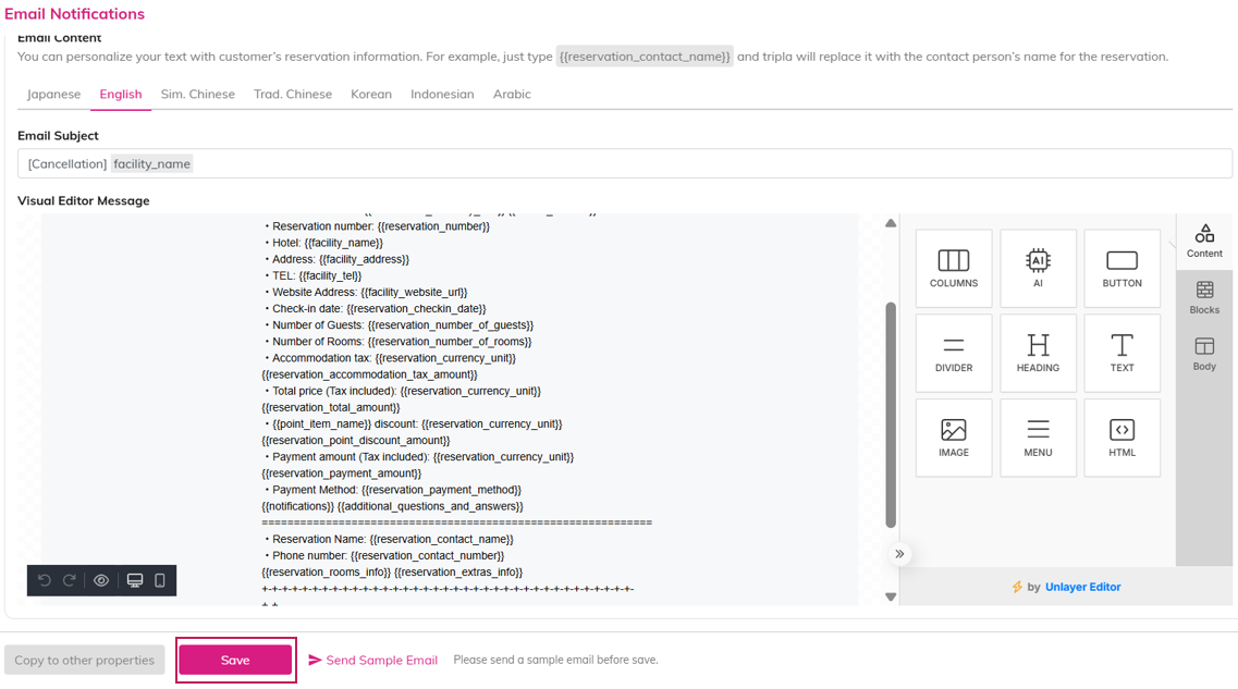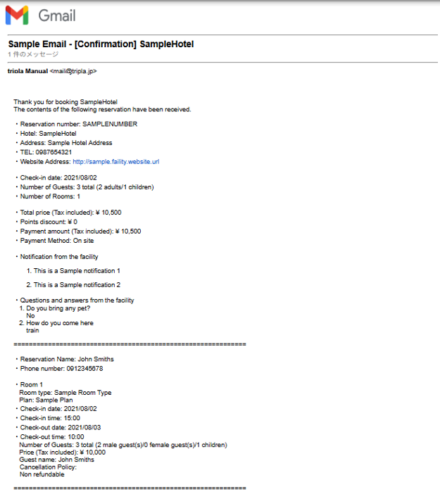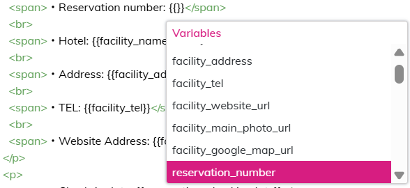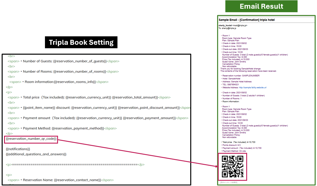 | Text | <p> <span>Thank you very much for booking with {{facility_name}}.</span> <br> <span>We are pleased to confirm your reservation as follows:</span> </p> <p> <span>・Reservation Number: {{reservation_number}}</span> <br> <span style="margin-left: 15px"> {{reservation_number_qr_code}} </span> <br> <span style="margin-left: 15px"> <i>Please scan the QR code.</i> </span> <br> <span>・Hotel: {{facility_name}}</span> <br> <span>・Address: {{facility_address}}</span> <br> <span>・Phone Number: {{facility_tel}}</span> <br> <span>・Official Website: {{facility_website_url}}</span> </p> <p> <span>・Check-in Date: {{reservation_checkin_date}}</span> <br> <span>・Number of Guests: {{reservation_number_of_guests}}</span> <br> <span>・Number of Rooms: {{reservation_number_of_rooms}}</span> </p> <p> <span>・Currency at the Time of Booking: {{reservation_currency}}</span> <br> <span>・Total (Tax Included): {{reservation_currency_unit}} {{reservation_total_amount}}</span> <br> <span>・Point Discount: {{reservation_currency_unit}} {{reservation_point_discount_amount}}</span> <br> <span>・Amount Paid (Tax Included): {{reservation_currency_unit}} {{reservation_payment_amount}}</span> <br> <span>・Payment Method: {{reservation_payment_method}}</span> </p> <p>=============================================================</p> {{notifications}} {{additional_questions_and_answers}} <p>=============================================================</p> <p> <span>・Guest Name: {{reservation_contact_name}}</span> <br> <span>・Guest Phone Number: {{reservation_contact_number}}</span> </p> {{reservation_rooms_info}} {{reservation_extras_info}} <p>=============================================================</p> <p>▼ You can check, modify, or cancel your reservation, or issue a receipt (for credit card payments) from the page below.</p> <p> <a href="{{reservation_url}}">{{reservation_url}}</a> </p> <p>※ After the check-in date or the time limit set by the hotel for changes/cancellations has passed, changes or cancellations cannot be made via tripla. You can check the change/cancellation deadline on the reservation confirmation page accessed through the link above. If the deadline has passed, please contact the hotel directly by phone.</p> <p>※ To extend or shorten your stay or change the number of guests, please make a new reservation.</p> <p>+-+-+-+-+-+-+-+-+-+-+-+-+-+-+-+-+-+-+-+-+-+-+-+-+-+-+-+-+-+-+-+-+-+-+-+-+-+-+</p> <span>* This email is automatically sent by the tripla reservation service.</span> <br> <span>* Please note that replies to this email will not be received.</span> <br> <span>This reservation was made using the tripla reservation service.</span> <br> <span>tripla Reservation Service</span> |