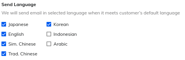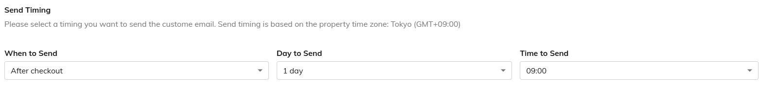 1. When to Send Thank you email only can be set [After Checkout]. 2. Day to Send Configure sending day, It can be set up to 14 days after checkout. 3. Time to Send The sending time can be set in 1-hour increments. ■Send LanguageThank you email can be send only on specific languages.