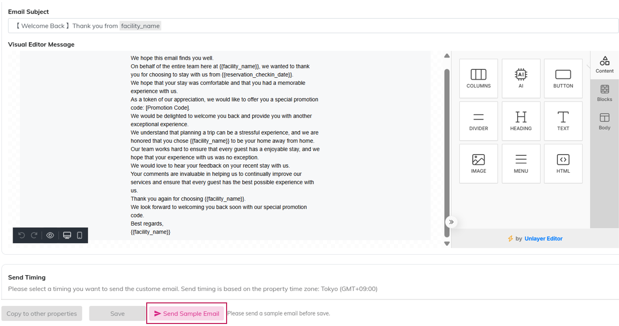 Step 1 ・Click [Send Sample Email] at the bottom of the screen.・The sample email is sent to the email address associated with the logged-in account.*If there is changes in the Text section, Save button will be disabled until sample email sent.Step 2 Click [Save] button to save changes.*Email template will be updated immediately, once the [Save] button is clicked.