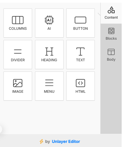 1. Content Set the content button, text or images. 2. Blocks Divide the email body into blocks and enter different content in each block. 3. Body Set the text color, background color, content width, alignment, font, and font weight.