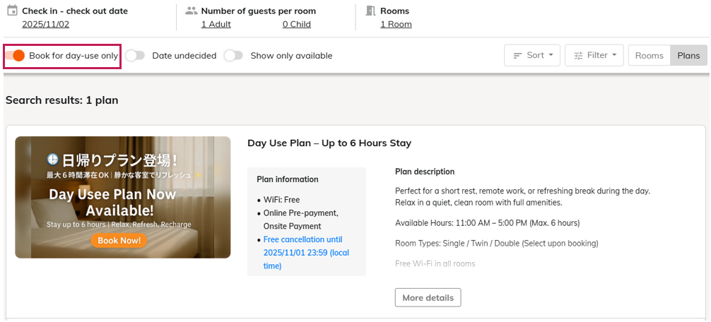 When the customer enable the switch, only Day-use plan will be displayed. | ||