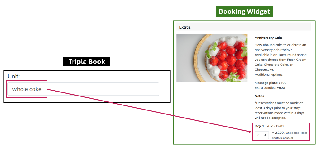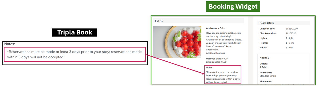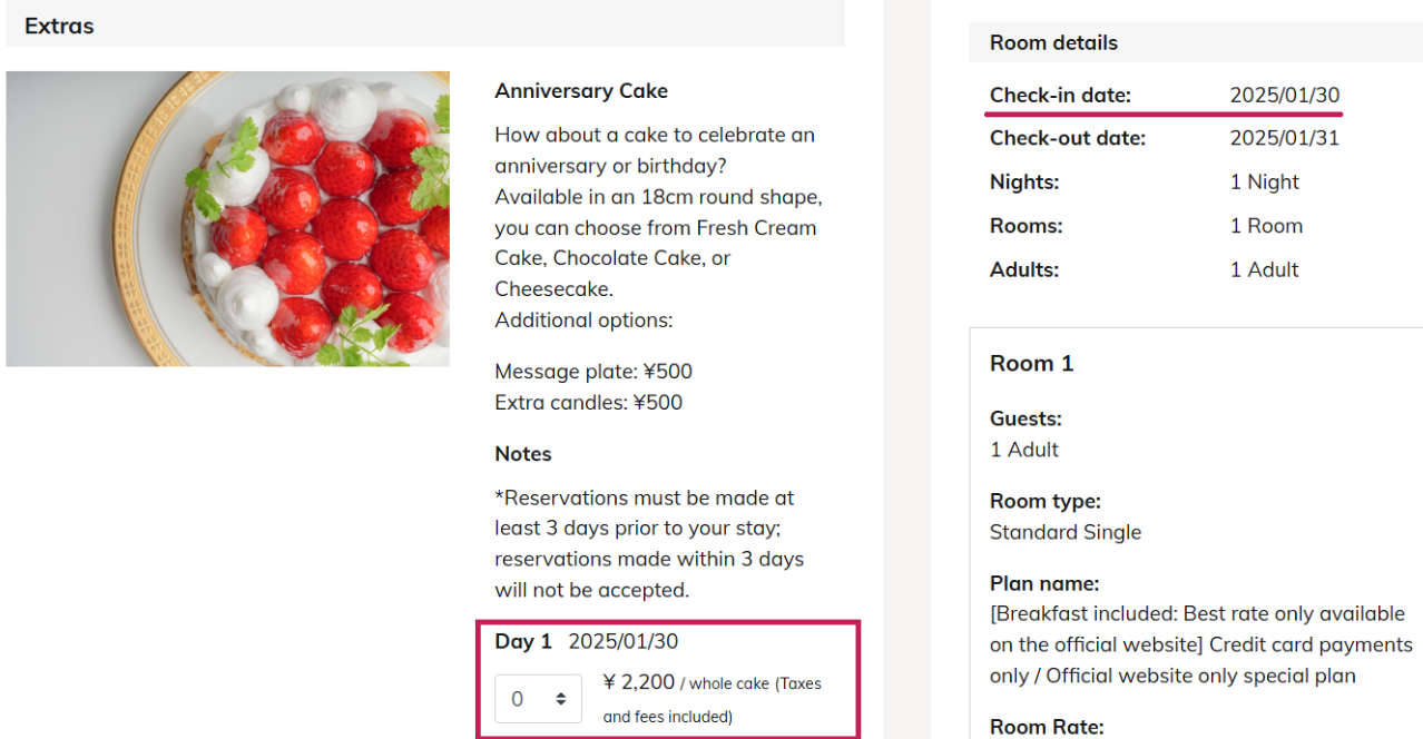 - If an Extra (for example, an anniversary cake) is set to be available on the checkout date, the system will allow the cake to be arranged even after checkout.