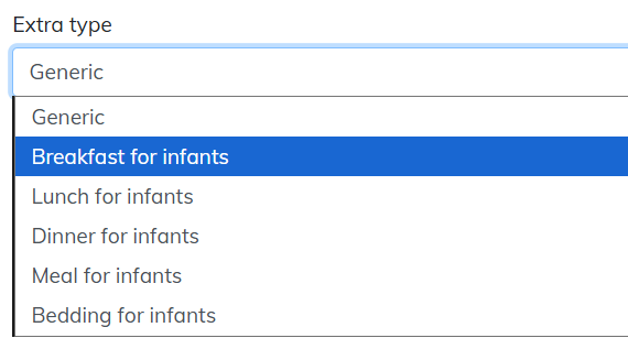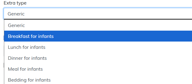 | Step 1 | Meal or bedding Extras for infants are available in the dropdown menu under “Extra type” on the Extra Management screen. |