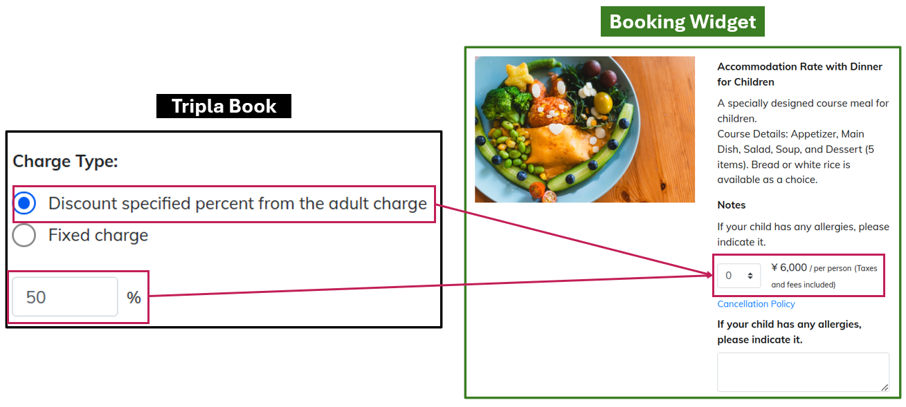 | Step 2 | ・In the Extra “Charge Type”, select "Discount specified percent from the adult charge". ・Set infant meals or bedding as a percentage of the adult rate and click [Save]. ▼Example: ・ Discount specified percent from the adult charge: 50% ・ Adult accommodation rate: 12,000 yen/person ・ The Extra price: 6,000 yen/person |