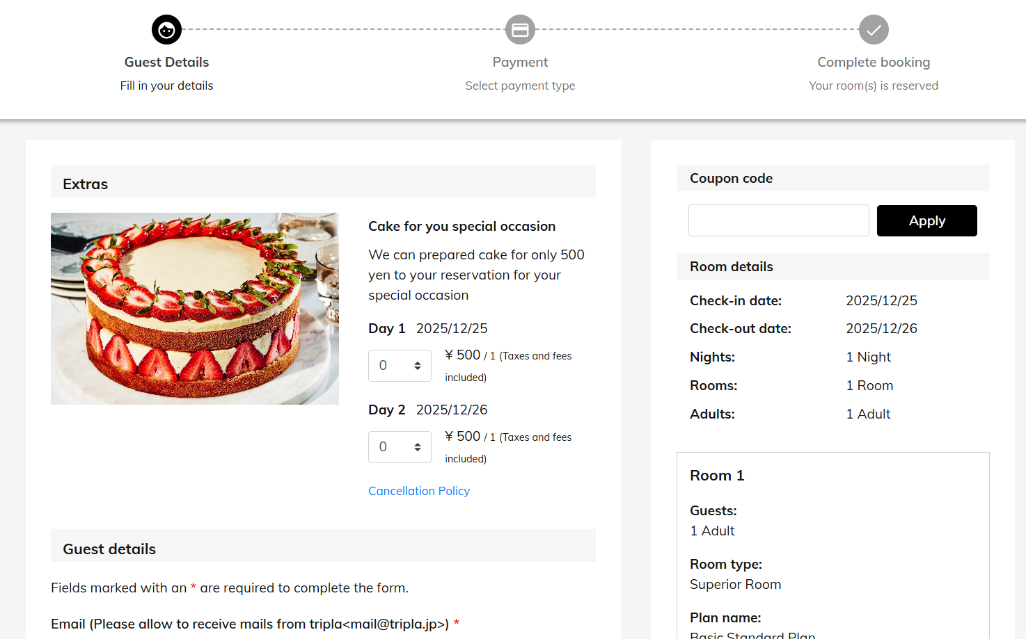 - The Extra will only be displayed on the "Guest details" if a plan with a checkmark is selected.