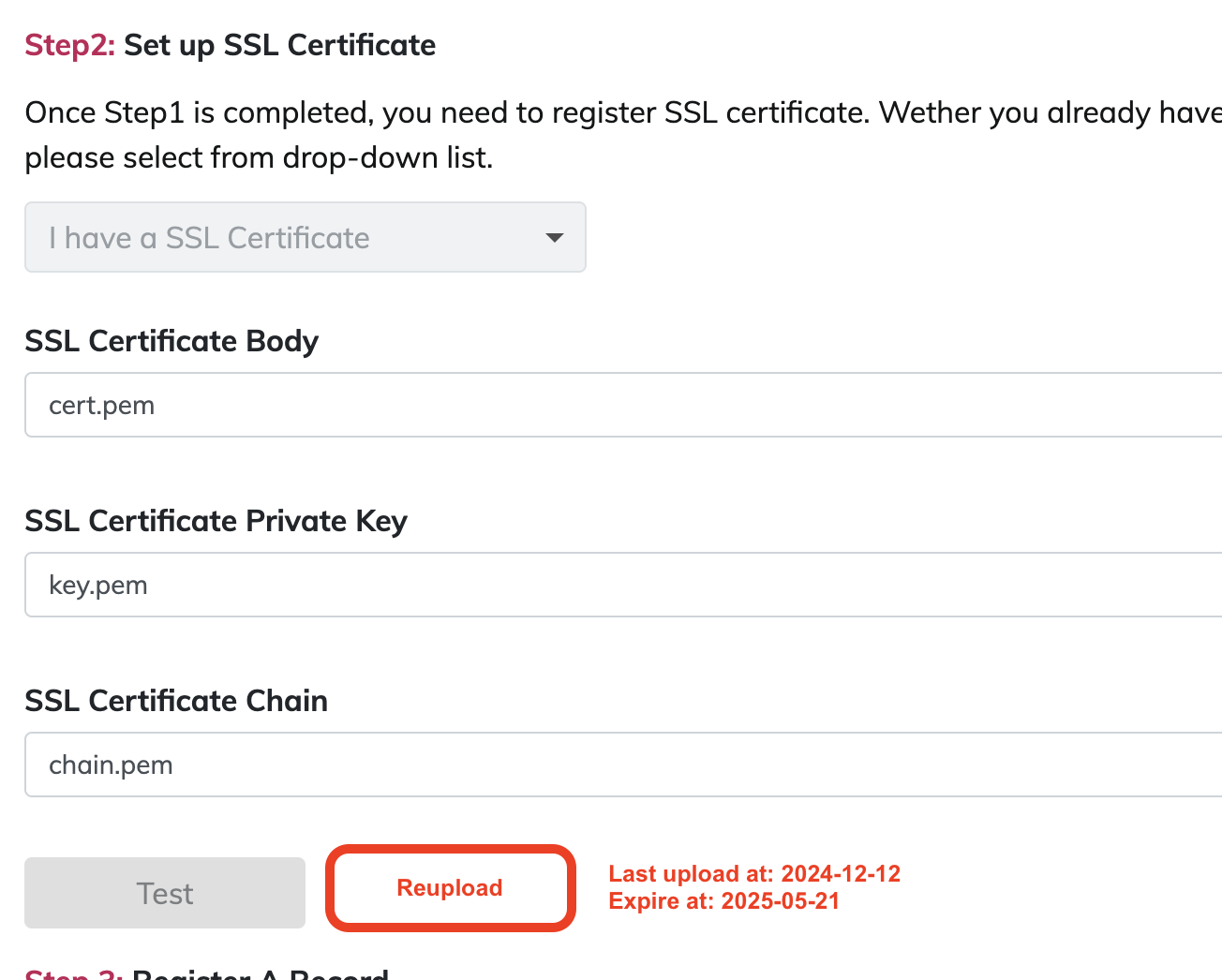 Upload the new certificate file in “SSL Certificate Settings” and click [Reupload].