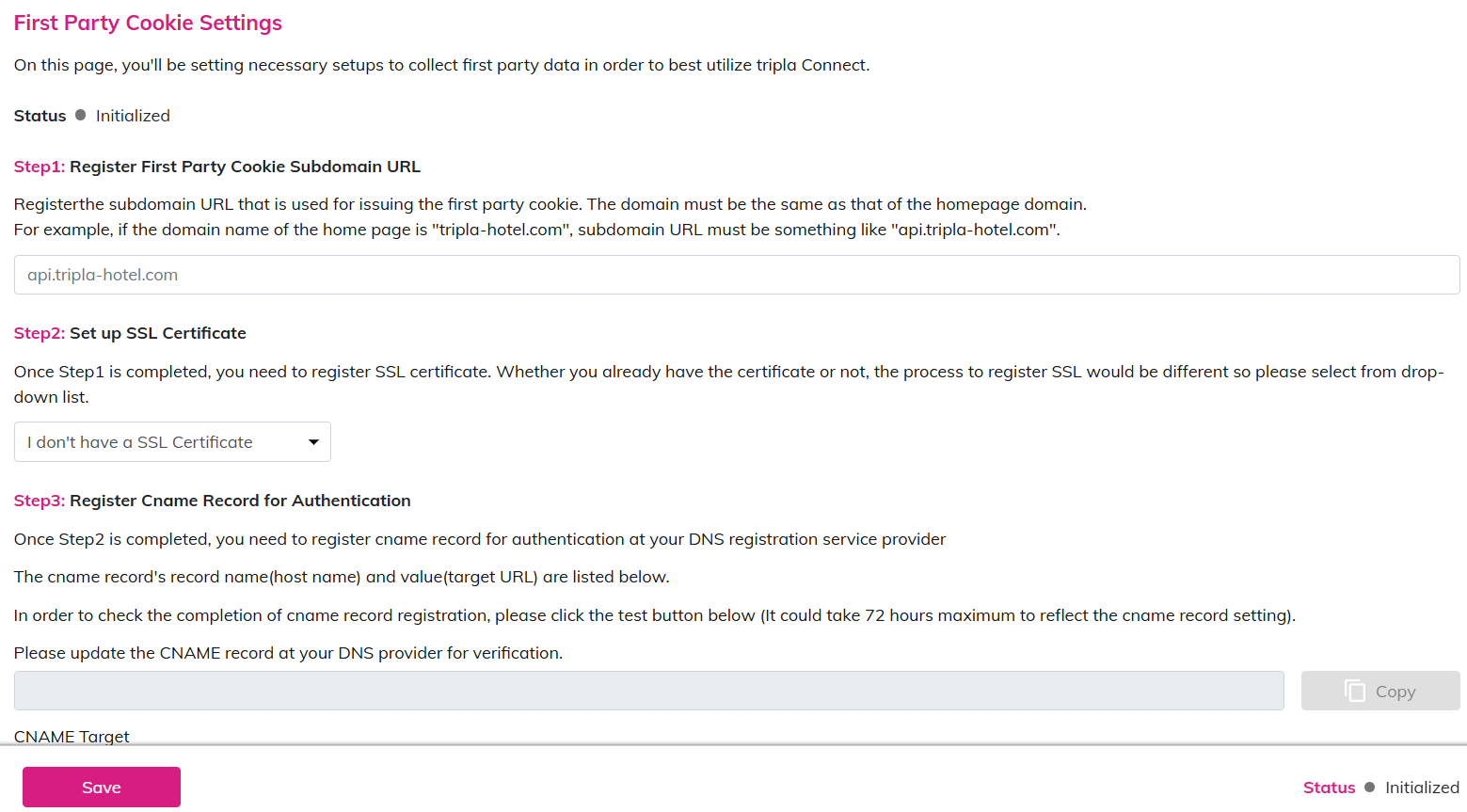 Once the subdomain URL is registered and the SSL certificate option ([I have a SSL Certificate] or [I don’t have a SSL Certificate]) is selected and saved, the subdomain URL cannot be changed afterward.