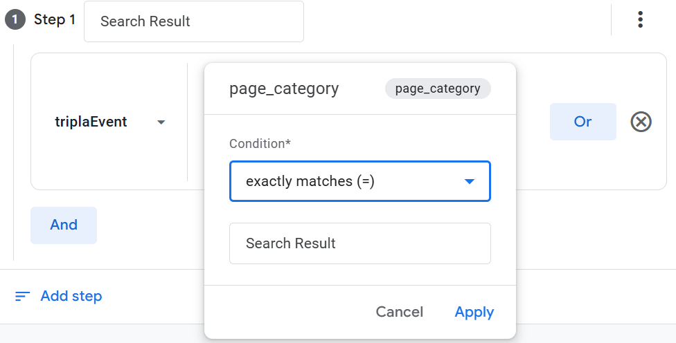 | Step 5 | ・In [Step 1], enter [Search Results] as the step name. ・Select [triplaEvent] from the event list. ・Select [Add parameter]. ・Select [page_category] from [Custom] or [Other]. ・From the condition dropdown, select [exactly matches (=)], enter [Search Result] in the input field, and click [Apply]. | ||||||||||||