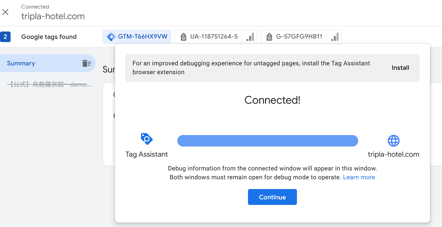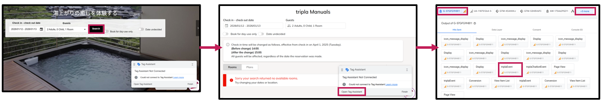 | Step 7 | ・Return to the opened "homepage" and open the search page. ・Click “Open Tag Assistant” to return to the "Tag Assistant" screen, where the "triplaEvent" tag is shown. |