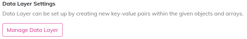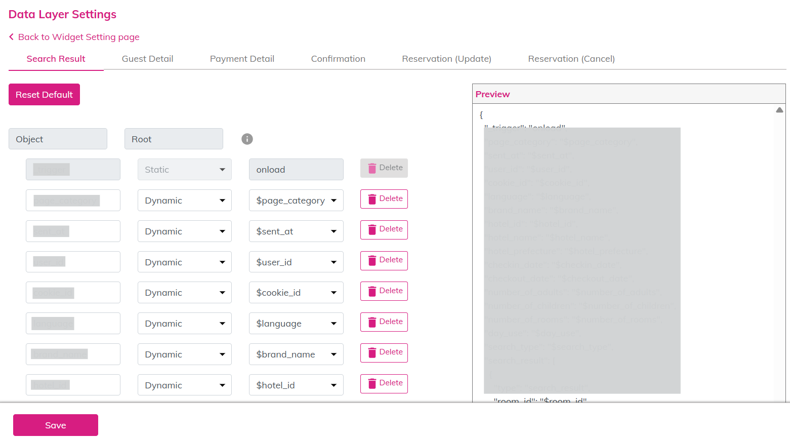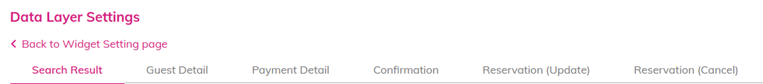 Step 1 Enter the customized tags in the <head> and <body> tags. Step 2 Click the [Manage Data Layer] button.Step 3 From the booking widget pages listed below, select the page from which the Data Layer should be sent:- Search Result- Guest Detail- Payment Detail- Confirmation- Reservation (Update)- Reservation (Cancel)Step 4 ・Enter the [key name], select either [Static] or [Dynamic], and then enter or select the value.・Unnecessary keys can be removed using [Delete].Step 5 After saving the settings in the tripla admin screen, the Data Layer being sent can be immediately verified on the corresponding hotel website.*The list of data currently available can be checked from the reference link.
