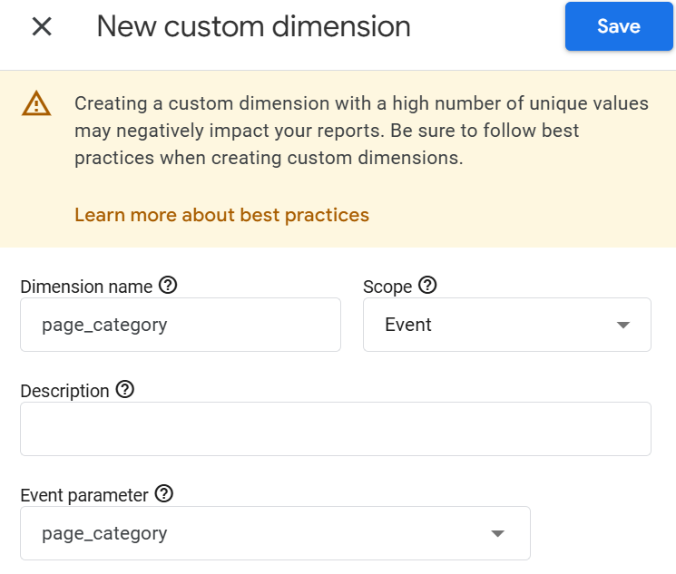 | Step 2 | On the "Custom dimensions" edit screen, click [Create custom dimension], enter and select the following values, then save. ・Dimension name: page_category ・Scope: Event ・Event parameter: page_category | ||||||||||||