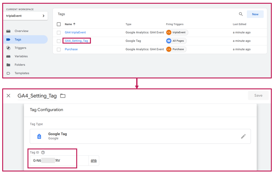 | Step 1 | ・Click the [Tags] to open the details screen, set the GA4 Measurement ID to be used for measurement, and then click [Save]. ▼Example: |