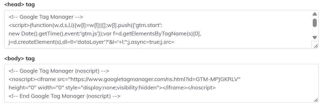 | Step 4 | Paste the GTM setup code that has been copied earlier into the <head> tag and <body> tag field. |
