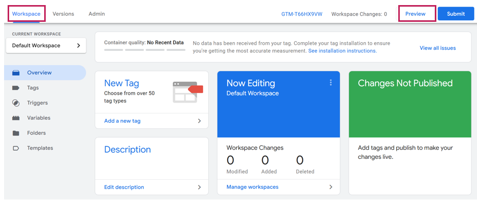 | Step 3 | ・After completing the above settings, events will start firing. ・Next, verify that the configured events are firing while checking the screen. ・Click [Workspace]. ・Once the "Workspace" screen is open, click the [Preview] button. |