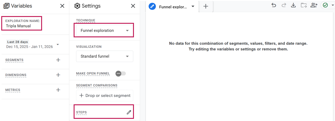 | Step 4 | ・Set the [Exploration Name] to any desired value. ・Select [Funnel exploration] as the technique. ・Select the [Steps] section. | ||||||||||||