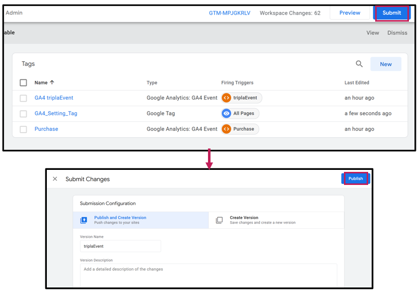 | Step 2 | ・Click the [Submit] button in the upper-right corner to open the "Submit Changes" screen. ・Click [Publish] to enable triplaEvent to fire. ・A confirmation screen will appear once the process is completed. |