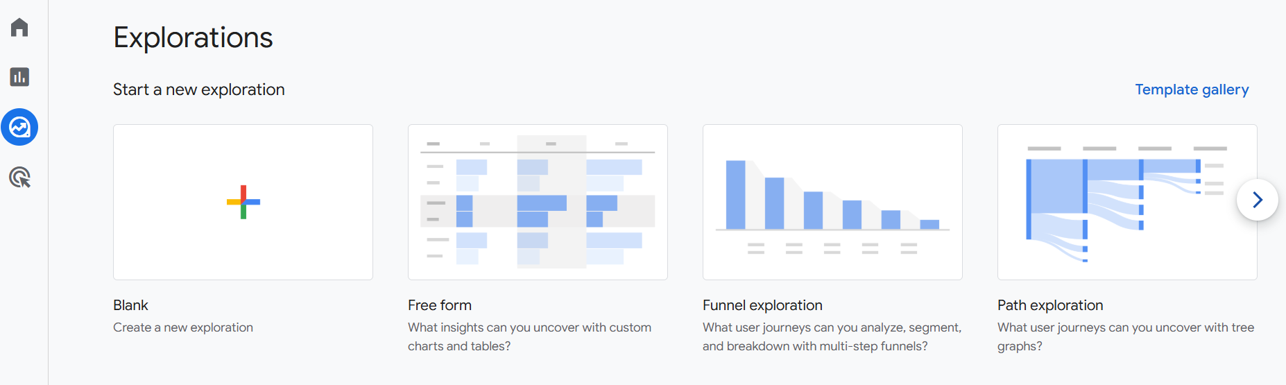 | Step 3 | Next, select [Explore] in GA4. Then select [Blank] to start a new exploration. | ||||||||||||