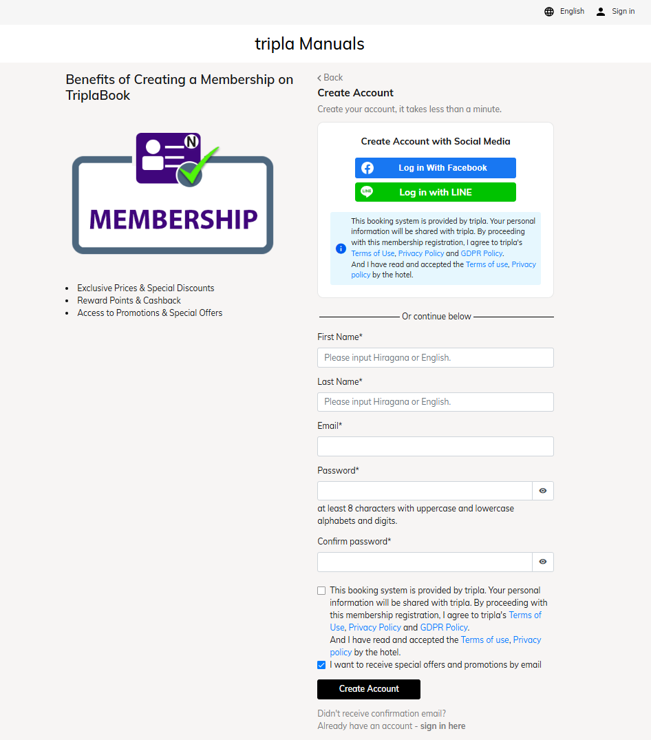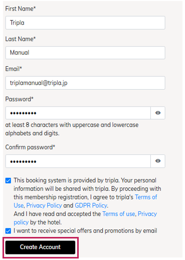 | Step 2 | ・Enter all required field, check the Terms of Use, Privacy Policy and GDPR Policy. ・Then click [Create Account] button. |