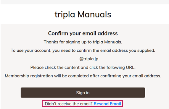 1. “A confirmation email has been sent” screen Resend the email from the screen that displays “Confirm your email address” as shown below. 2. Membership registration screen Click [Didn't receive confirmation email?} 3. Member Sign in screen Select [Forgot your password?] to send a password reset email.*If the issue still cannot be resolved after trying the above steps, please consider changing the email address.