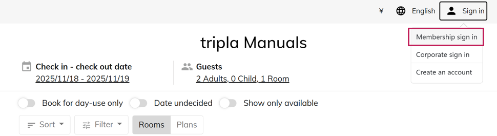 | Step 4 | The customer can now Sign in with their account, by clicking [Membership sign in] from the drop down. |