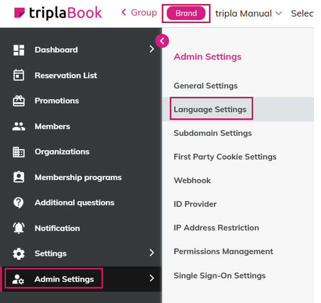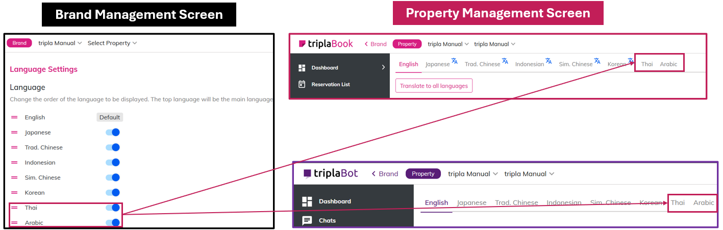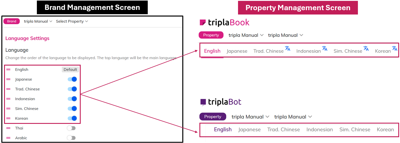 Languages setting configured under "Brand Management Screen" will apply to all Tripla services.