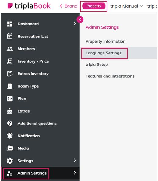 To display a specific language on the "Property Management screen", the target language must first be enabled in the "Brand Management screen".