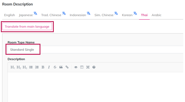 - By clicking [Translate from main language] button, the "Room Type Name" and "Description" will be translated to target language automatically