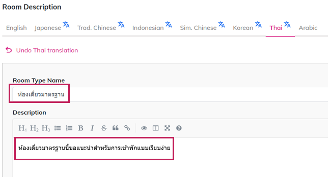 - When new language is enabled, "Room Type Name" will be copied from default language, while the "Description" Field remain empty.