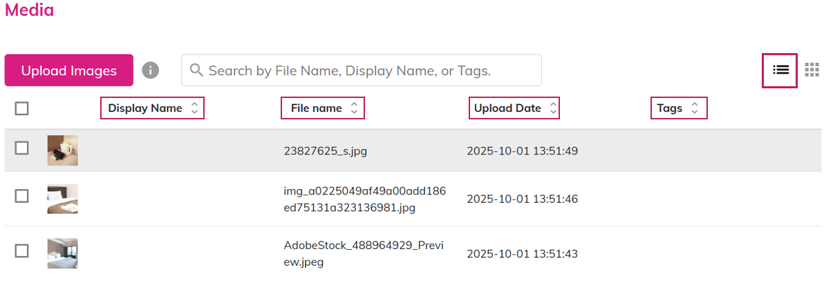 Images are displayed in a table format, where Display name, File name, Upload Date, and Tags are displayed.