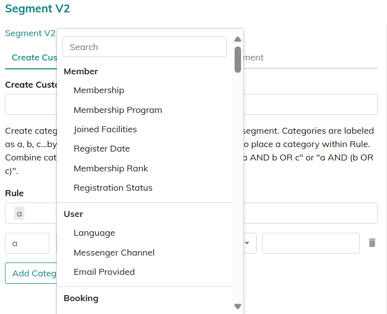 Category Operator Value Type Description1. Language Include / Not Include Select applicable language from drop down. Specify the users language. 2. Messenger Channel Include / Not Include LINE / Facebook Select the Messenger channel. 3. Email Provided Equal to Provided / Not Given Specify whether email opt-in is enabled. 2.3 Booking
