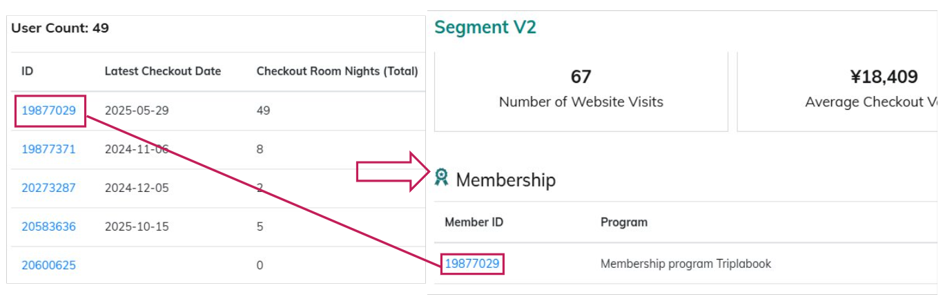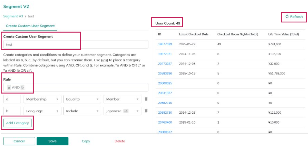 | 4. Update Button and User List | ・After setting the "Rule", clicking icon [Refresh] in the upper-right retrieves the results. ・The results display: - Member ID - Latest Checkout Date - Checkout Room Nights (Total) - Life Time Value (Total) *Non-member (anonymous) guests are based mainly on cookie information, so personal details are not shown. |