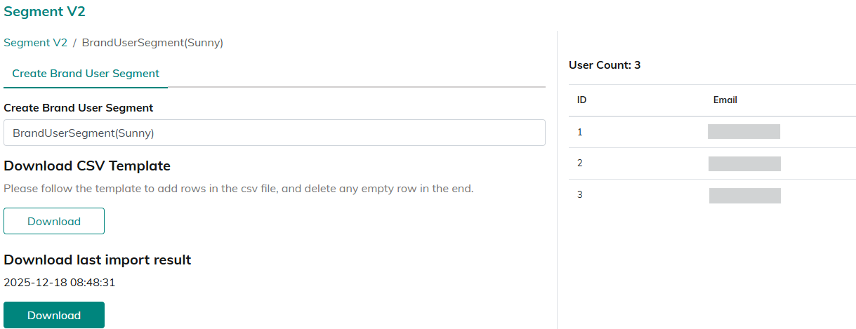 Step 1 Click [Download] for "Download last import result" to check the latest upload. Step 2 Review for any errors and add or remove email addresses as needed. Step 3 Upload the updated CSV template again to overwrite the segment with the new list.