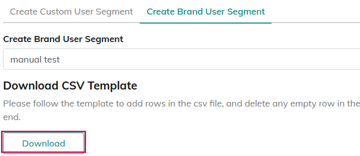 | Step 4 | ・Save the CSV template and upload it. ・When [Save] is clicked, the data is imported and the segment is created, and only the "Create Brand User Segment" tab is displayed. |