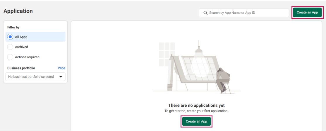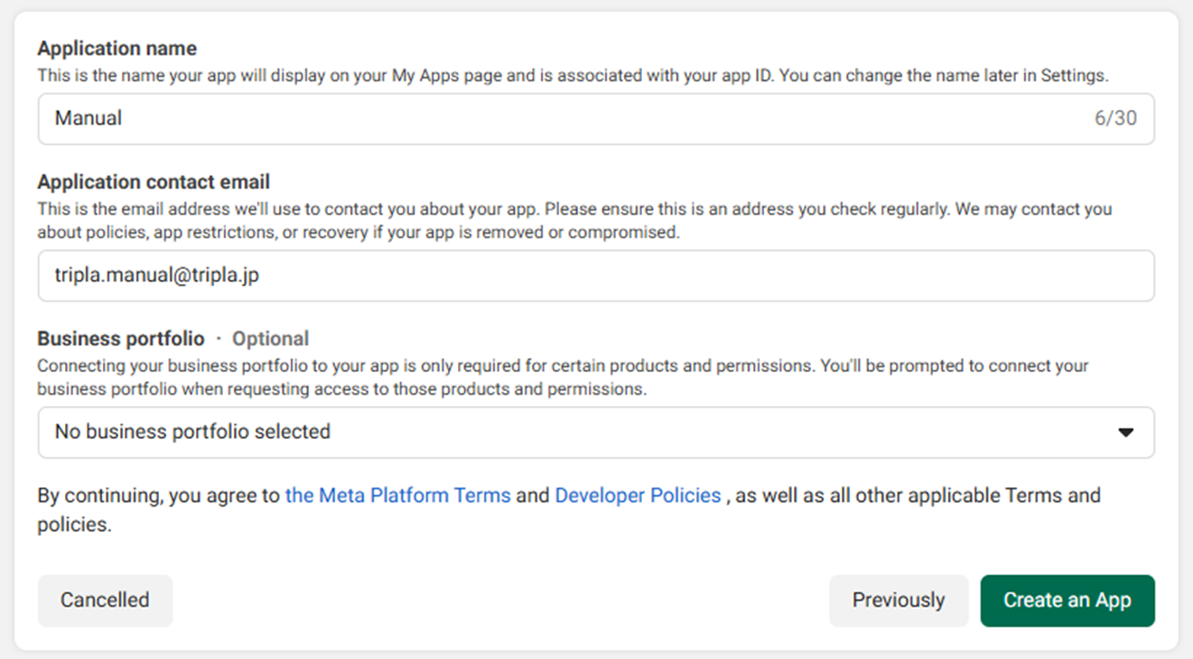 ・Click [Create an App] either in the top-right corner or center of the screen.Step 2 ・Choose an app type. Step 3 ・Enter the "Application name" and "Application contact email" field.・Then click [Create an App].Step 4 ・After completing the App creation, following screen will be displayed.