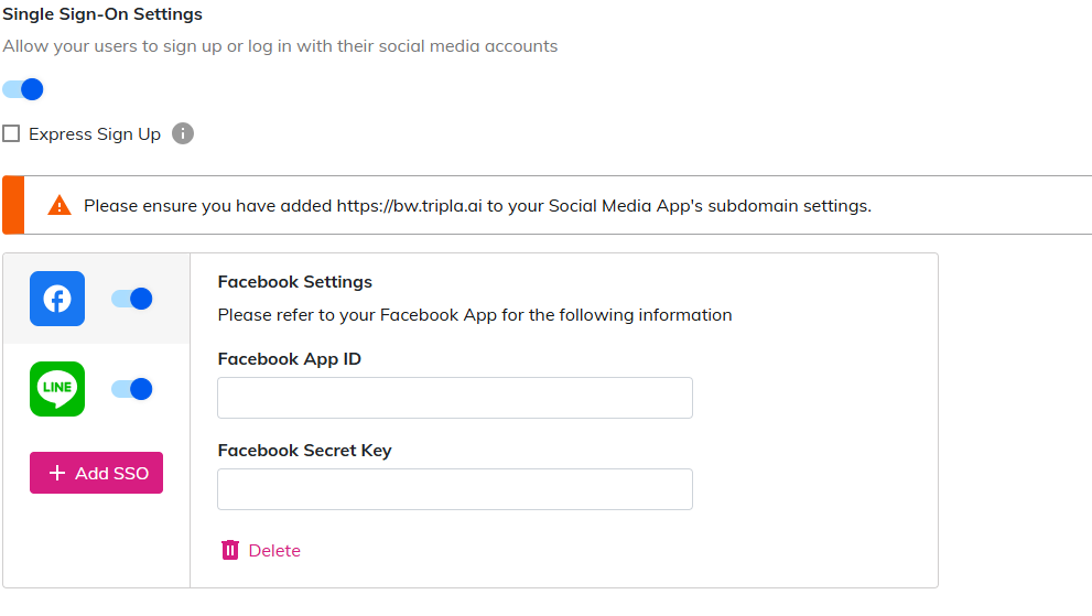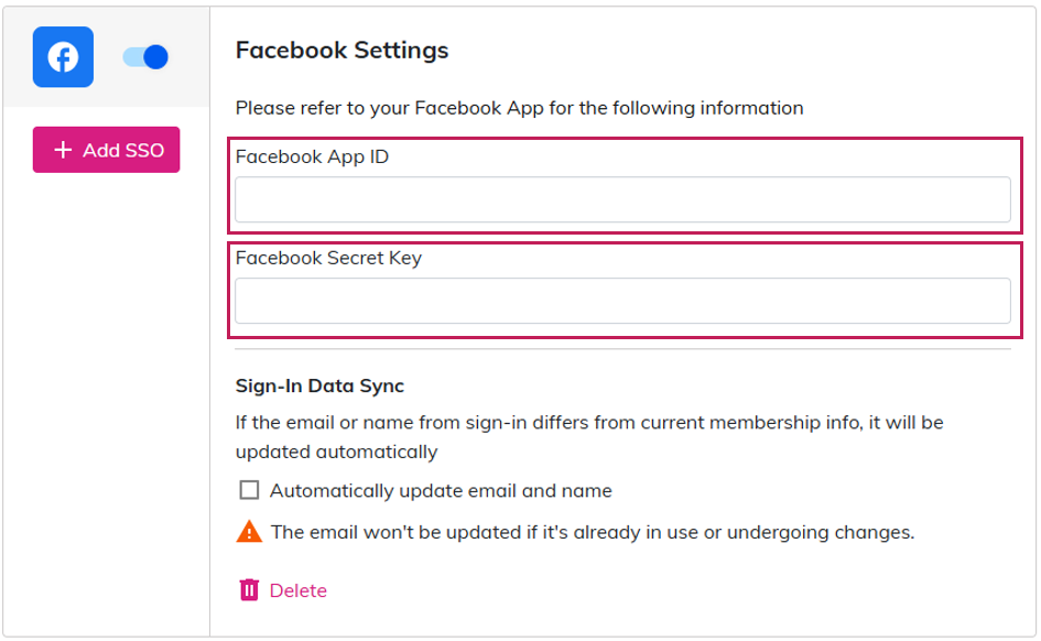 Step 1 Enable the SSO, click [+ Add SSO] and choose [Facebook].Step 2 ・Enter the Facebook App ID and Facebook Secret Key.・Facebook App ID and Facebook Secret Key can be found at Facebook Developer Console: "Application Settings" → "Base".Step 3 After entering the information, click [Save] on the bottom of the screen to complete the setup.