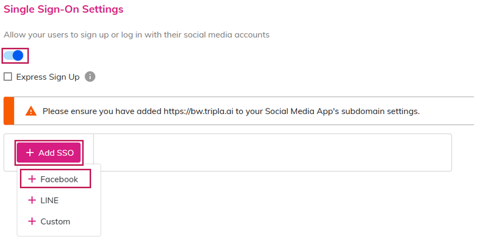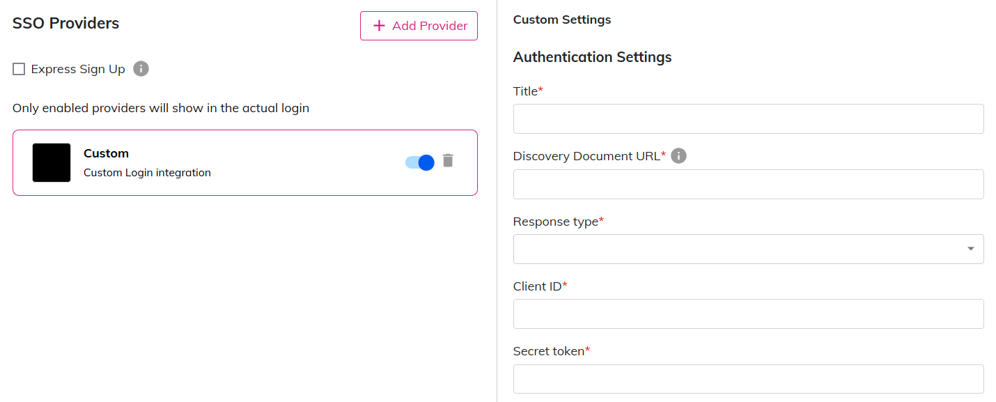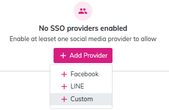 Step 1 Click [Enable Social Media SSO].Step 2 Click [+ Add Provider] and select [Custom] to add a provider. Step 3 Enter the SSO provider information and save.▼Authentication Settings