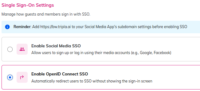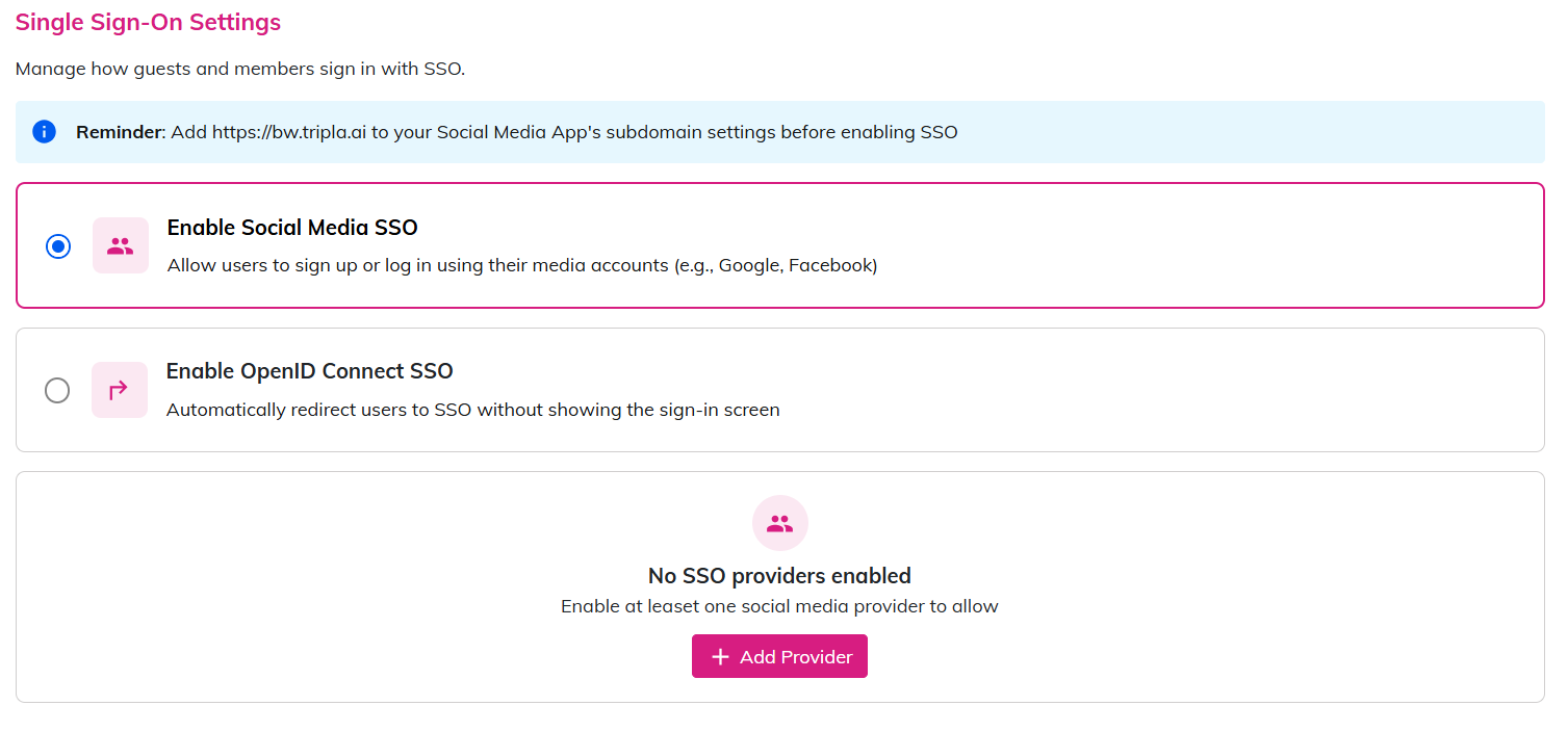 SSO settings in the tripla admin panel are configured at the brand level.Existing property-level SSO settings can continue to be used.