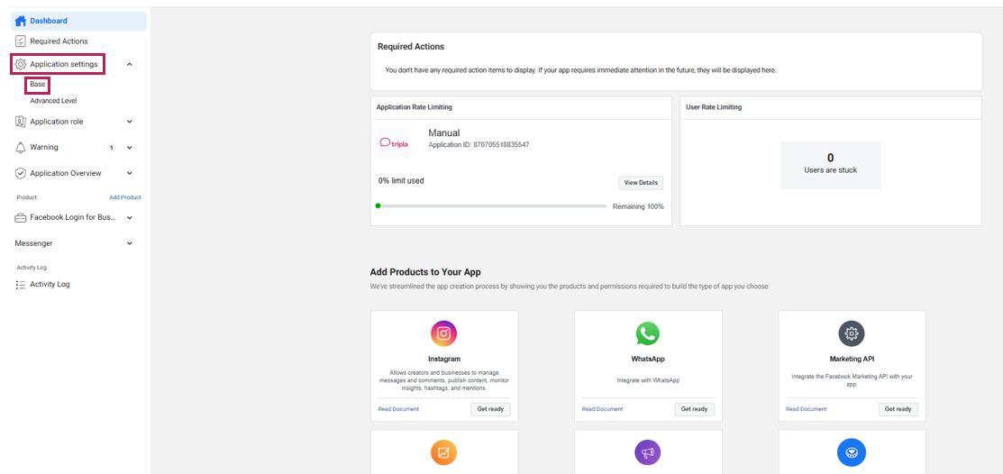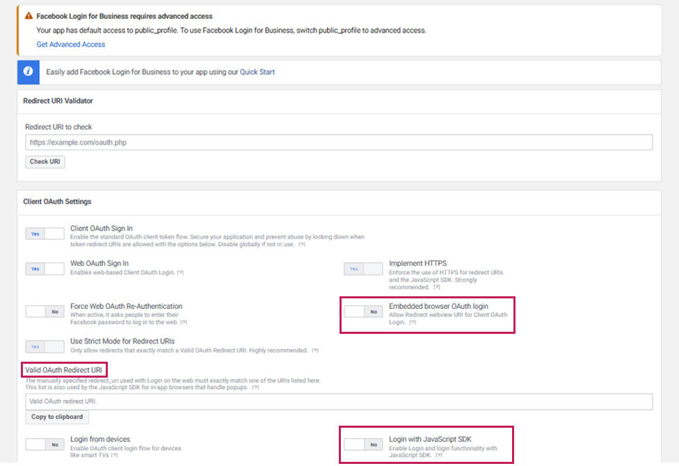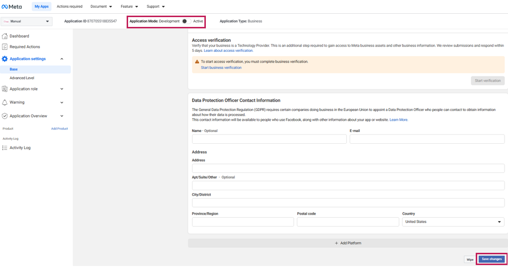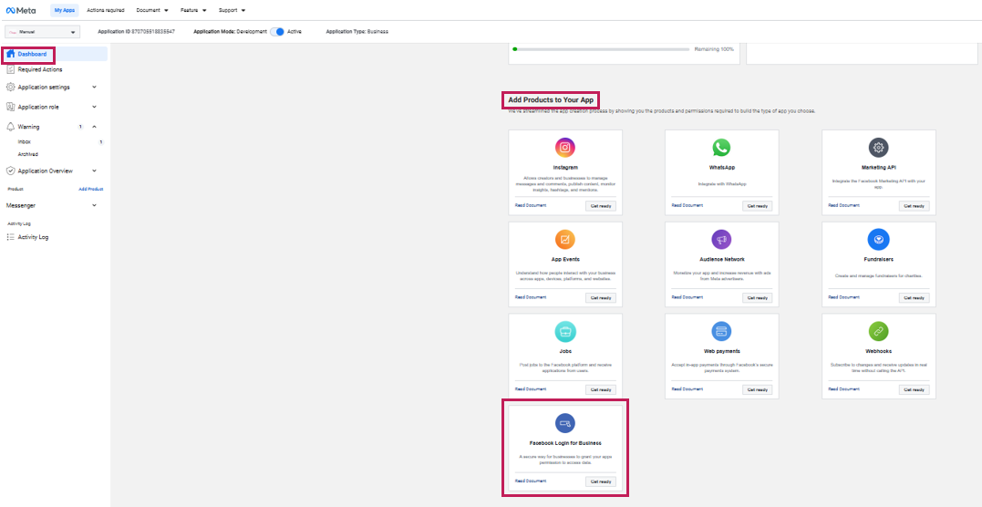・Verification: Complete Facebook Business Verification.*For detailed setup instructions, please contact Facebook support.Step 6 ・At the bottom of the screen, click [Save Changes] to register your settings.・Once the setup is complete, switch the "Application mode" from [Development] to [Live].Step 7 ・Go to 'Dashboard' → "Add a Product to Your App",・Select [Get Ready] under "FacebookLogin for Business".Step 8 ■ Enable the following settings:
