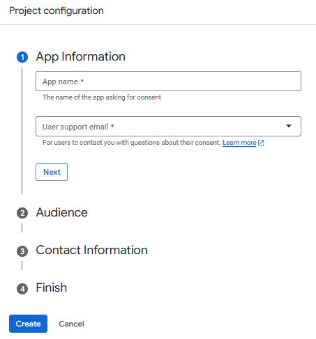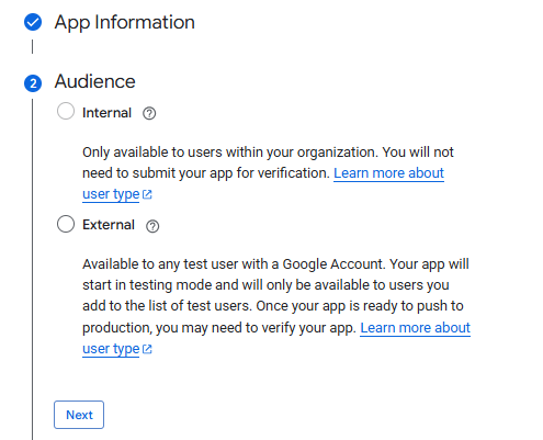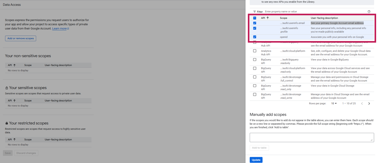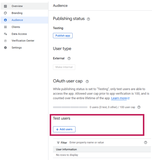Step 1 Go to 'APIs & Services' → 'OAuth consent screen'. Step 2 Enter the App Information. Step 3 Set the Audience Type to [External] and click [Next].Step 4 Go to 'Data Access', click [Add or remove scopes].From the filter list, select the following three checkboxes:・See your primary Google Account email address・See your personal info, including any personal info you've made publicly available・Associate you with your personal info on GoogleStep 5 Go to 'Audience' to configure test users.If testing the app behavior, add users as test users.6.3 Credential