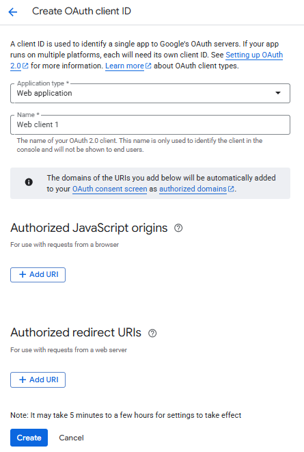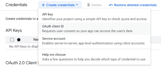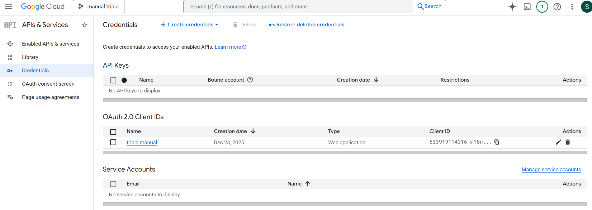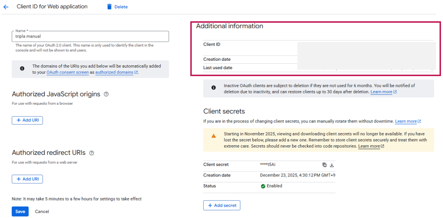 Step 1 From the left menu, select [Credentials].Step 2 Select [+ Create Credentials] → [OAuth Client ID].Step 3 For Application Type, select [Web Application].Enter the information on the following page. Step 4 Once created, the credentials are displayed in the OAuth 2.0 Client IDs list.Select the item to view the details. Step 5 Check the Client ID and Client Secret, then register them in the tripla admin screen.