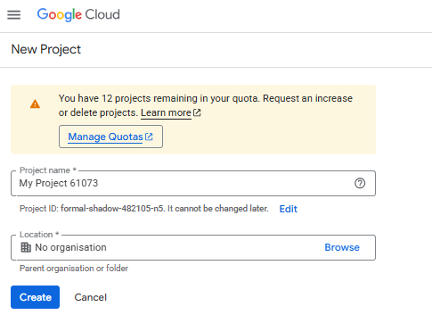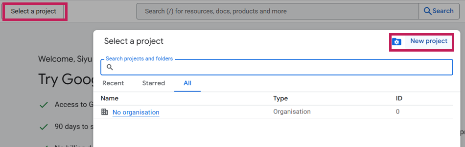 Step 1 ・Log in to the Google Cloud Console and create a project.・Access the Google Cloud Console from the following URL:・After logging in, a screen like the one shown below is displayed.Step 2 ・Click [Select a Project] → [New Project]. Step 3 ・Set the Project Name and Location, then click [Create].