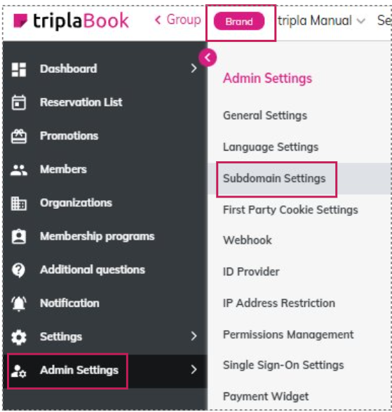 - Action: 'Admin Settings' → [Subdomain Settings]