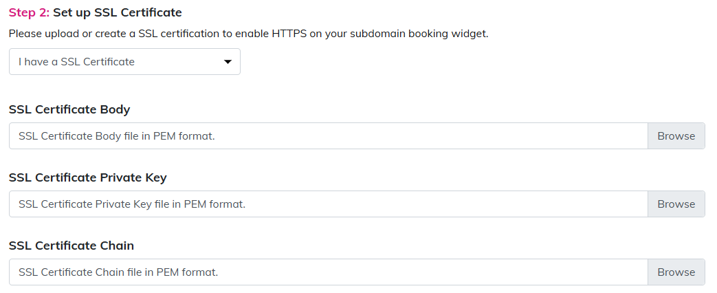- The "SSL Certificate Body", "SSL Certificate Private Key", and "SSL Certificate Chain (Intermediate Certificate)" must be uploaded in PEM format.
